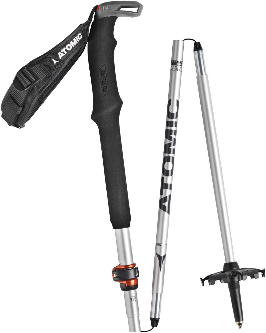Atomic BCT Mountaineering SQS is a top foldable ski touring pole for endurance tourers. It’s made from high-grade aluminum that’s very light but with high tensile strength. It’s constructed just like a probe – 5 pieces connected through a string inside – so all you have to do is press a button and it folds down to 40cm in seconds – easy to pack away.