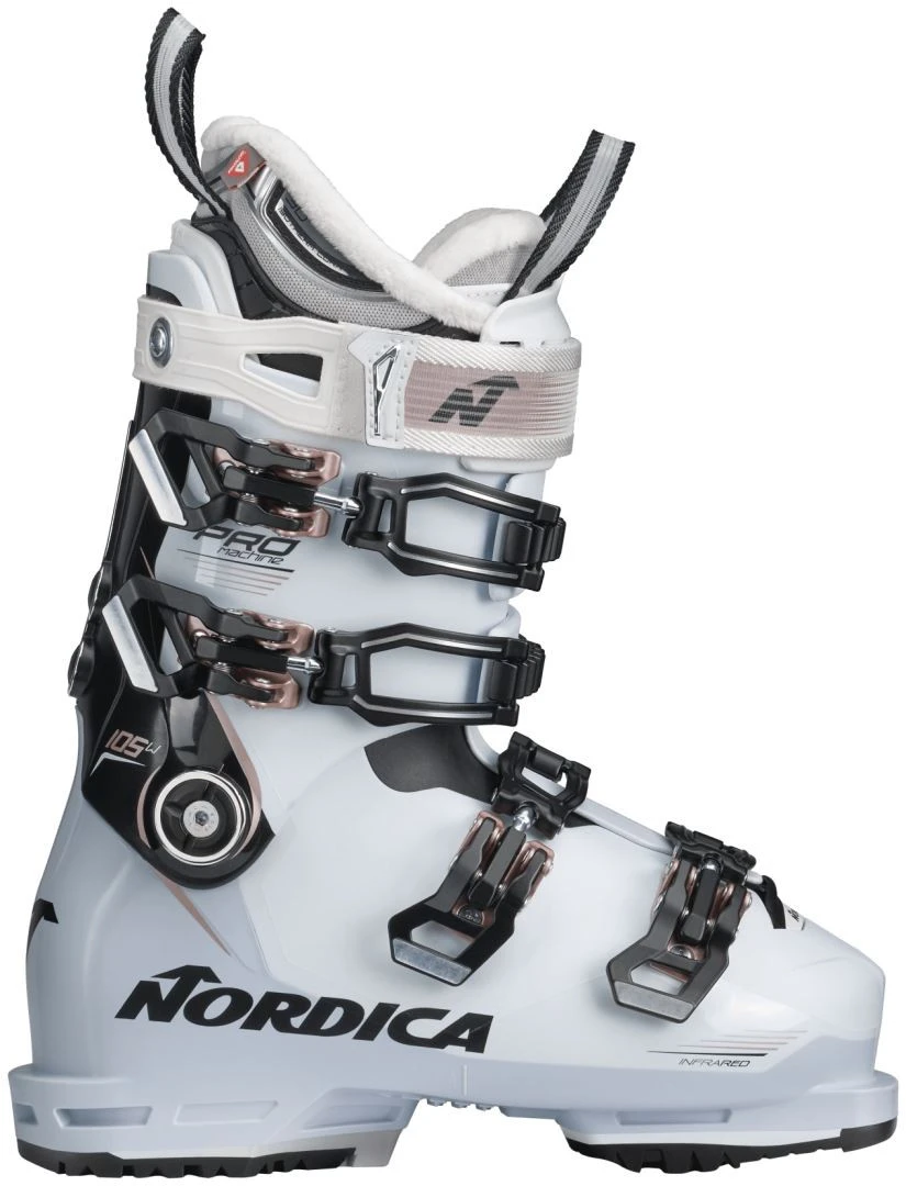 De Nordica Pro Machine 105 W (GW) is een skischoen met een laag volume, geschikt voor smalle voeten of voor skiers die op zoek zijn naar een strakke fit.